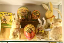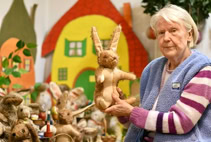Pico ist nicht irgendein Hase. Er stammt aus der berühmten Steifftier- Sammlung aus der Zeit des Ersten Weltkriegs, ist also rund 110 Jahre alt. Im Bestand von Gutersohn ist er seit rund 40 Jahren, zusammen mit zwei anderen Hasen, die damals gekauft wurden. Insgesamt gibt es inzwischen acht Picos, immer mit anderen Namen, die die Rhederin mit echten Steiff-Stoffen selber genäht und mit Holzwolle gefüllt hat.